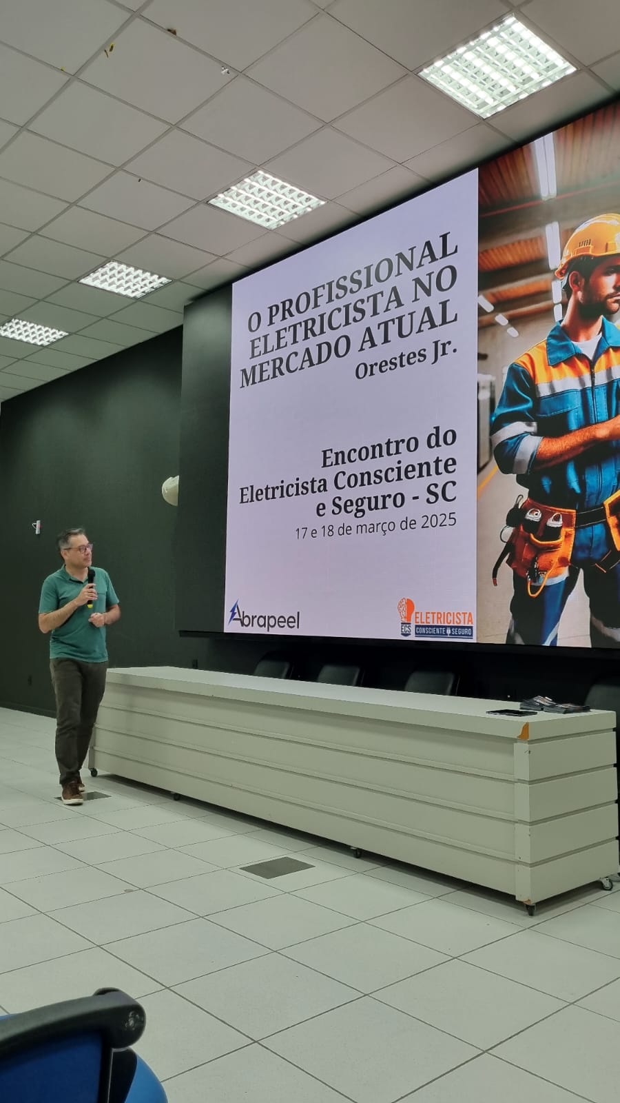 Em seguida, Edson Martinho passou a palavra para o diretor-executivo da Abrapeel, Orestes Rodrigues Junior, que também deu as boas-vindas e comentou rapidamente sobre a parceria de uma associação que visa reconhecer o profissional eletricista, juntando a conscientização em utilizar produtos e equipamentos com segurança.